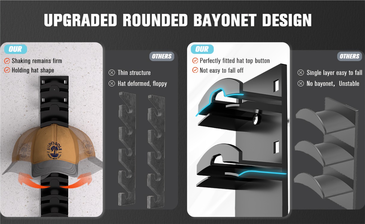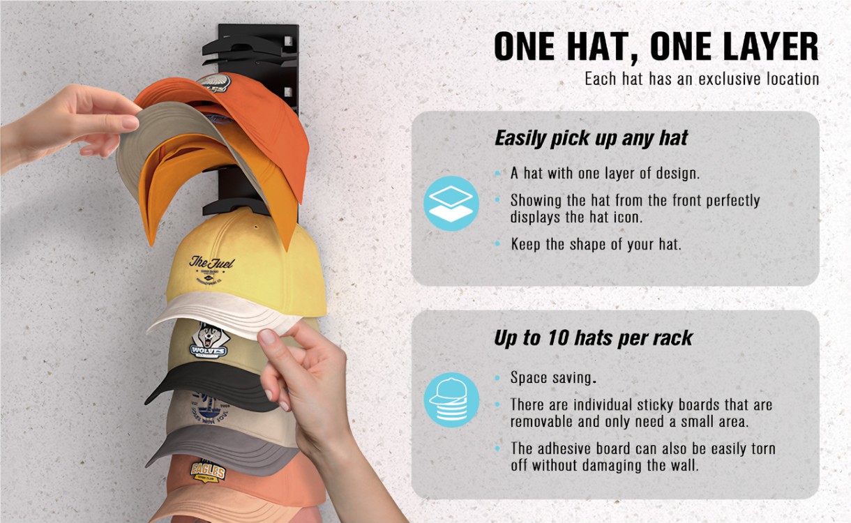 2-Pack Hat Rack - Space-Saving Wall-Mounted Hanger for Caps, Hats & Accessories帽架两个装,节省空间的壁挂式挂架,适用于棒球帽、帽子及配饰