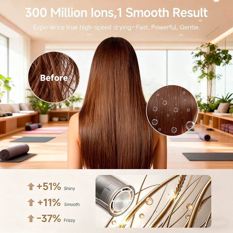 300 million negative ions smooth frizz . With 6-layer acoustic insulation, it runs under 60 dB. Its NTC thermistor and smart chip monitor temperature 300x/sec, keeping airflow below 134.6°F to prevent heat damage .