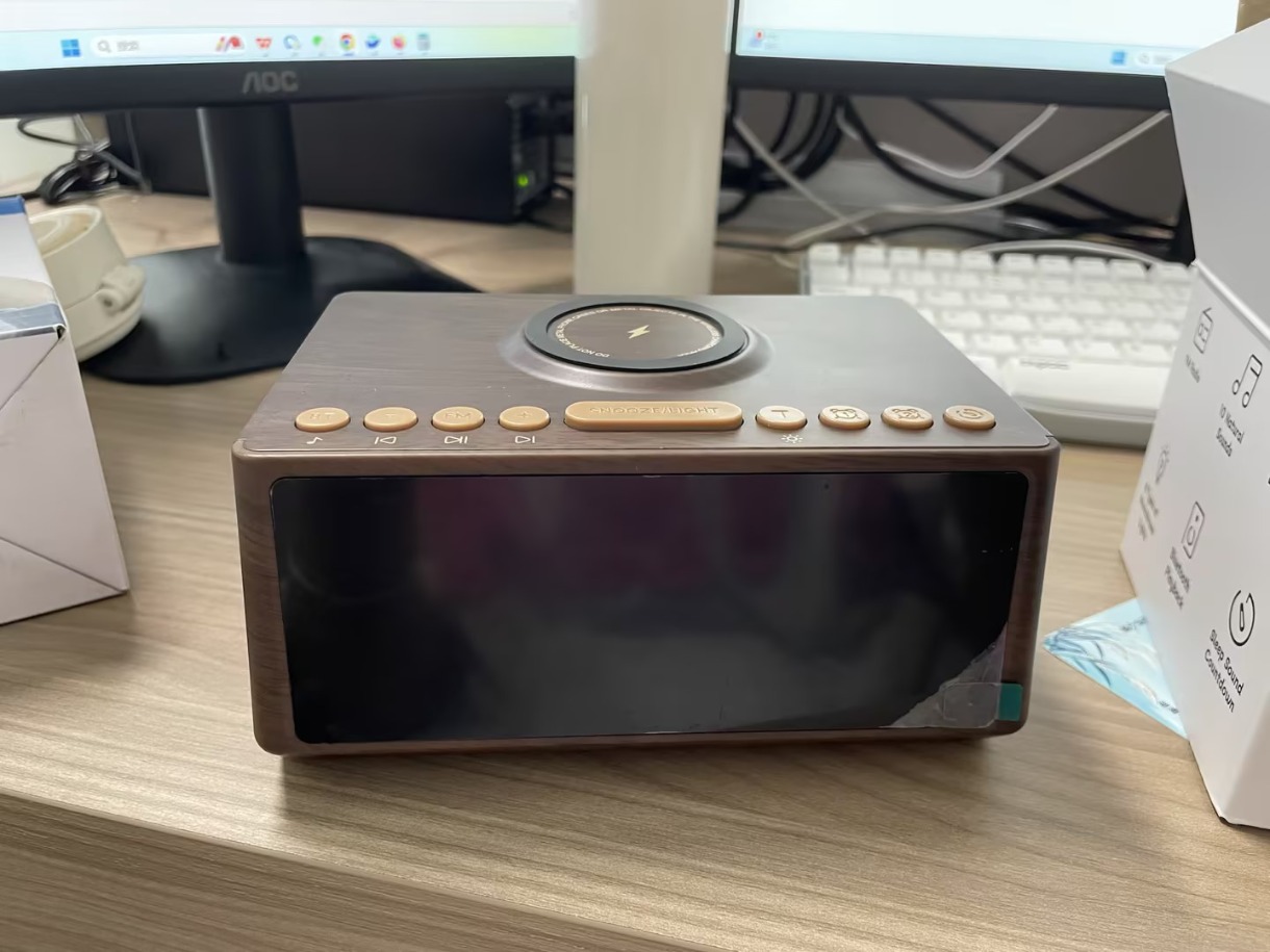 自营10W Wireless Charger LED Alarm Clock with FM Radio Bluetooth Speaker Fast Charging Multi Functional 10 瓦无线充电器 LED 桌面闹钟,新款热销 10 瓦无线充电器 LED 桌面闹钟,带有调频收音机、蓝牙音箱(功能),支持无线(使用)。