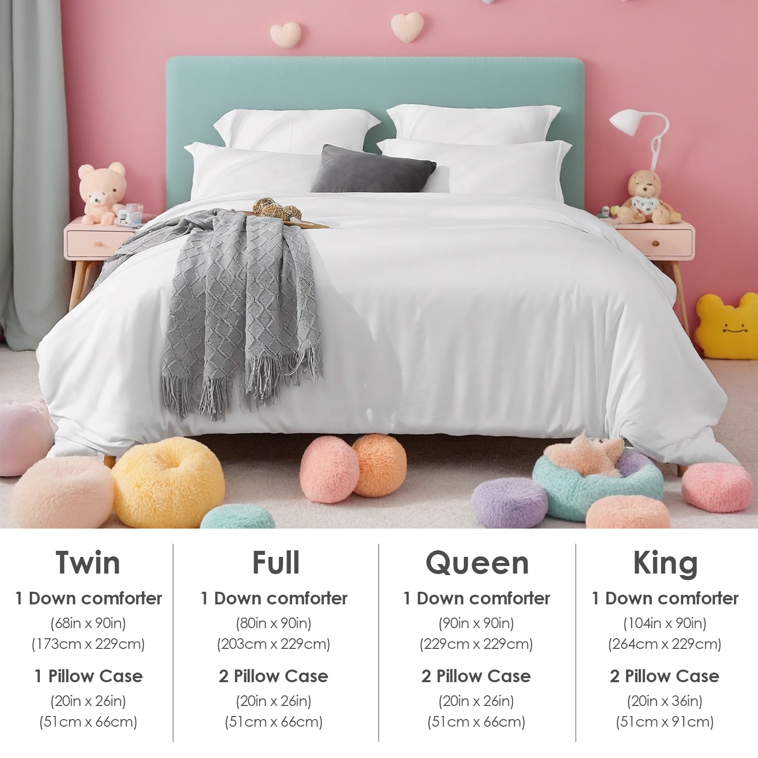 Duvet Cover: 229cm × 229cm × 1pc Pillowcase: 51cm × 66cm × 2pcs Duvet Cover: 263cm × 229cm × 1pc Pillowcase: 51cm × 92cm × 2pcs