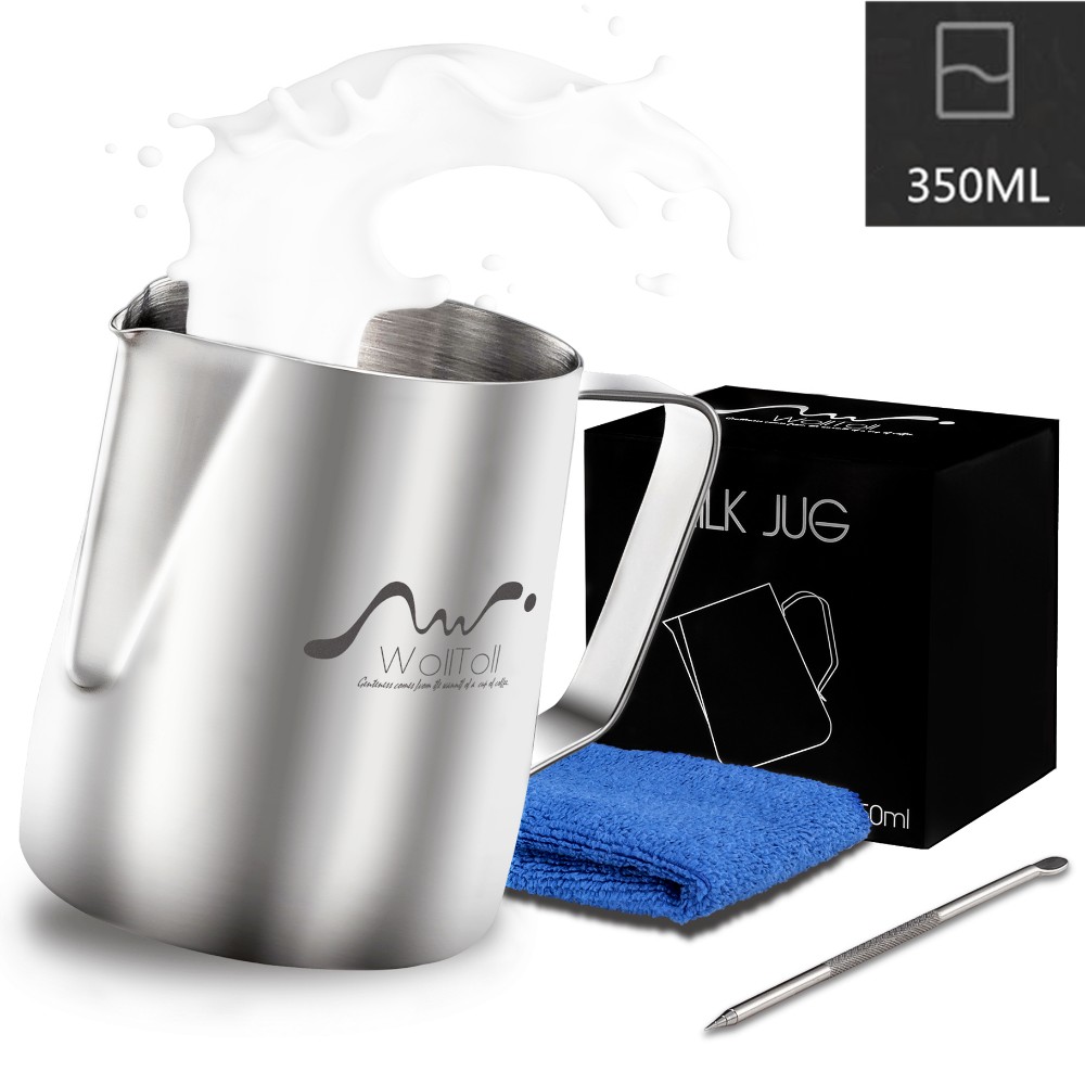 首页> 全部类目> 咖啡制作工具> Professional 12oz (350ml) Stainless Steel Milk Frothing Pitcher - Barista Grade Latte Art Jug with Inner Measurements, Includes Decorating Pen & Microfiber Cloth for Cappuccino & Coffee