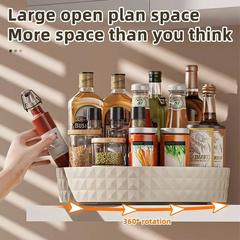 1. Large capacity storage: This rotatable multifunctional seasoning storage rack has multiple compartments and a large capacity, which can easily hold various types of oil, salt, sauce, and vinegar bottles, solving the problem of messy kitchen bottles and jars.