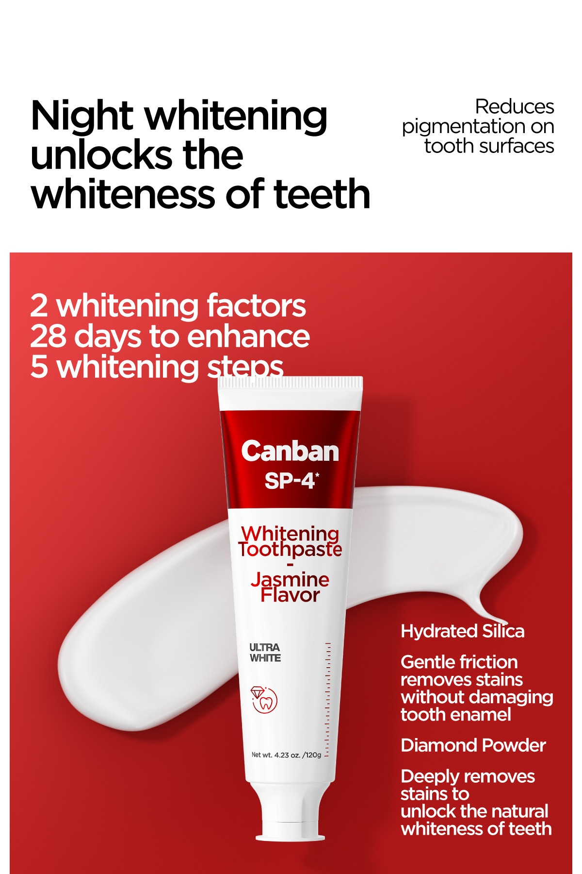 首页> 全部类目> 牙膏> Canban SP-4 Whitening Toothpaste (120g + 20g Travel Size) - Enamel-Safe Brightening Formula with Natural Extracts | Fresh Mint Flavor | Stain Removal & Sensitivity Relief