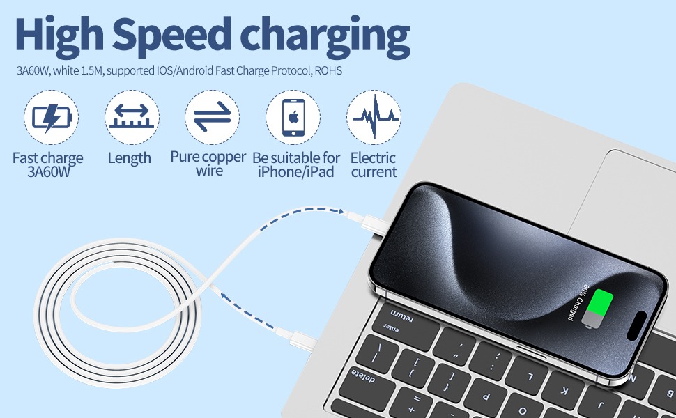 首页> 全部类目> 数据线、充电器和适配器> 60W Fast Charging Cable (3A) - 1.5M White USB-C to USB-C PD Quick Charge Cable | Compatible with iPhone, Android Devices, iPad & More - Durable & Tangle-Free Design