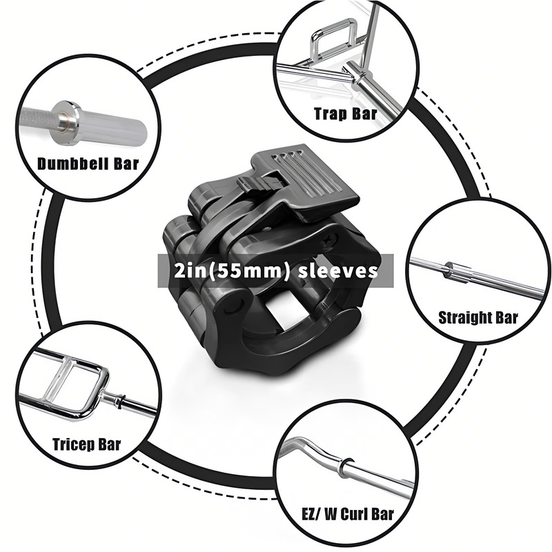 Fastens to all standard Olympic bars with 2'' (50MM) sleeves. 10 times stronger grip than Olympic bar clamps (ABS Locking). Easy to use, one hand install with spring-powered snap-latch design to keep you safe. Perfect for cast plate, cast grip plate and rubber grip plate, a must-have for bar workout.