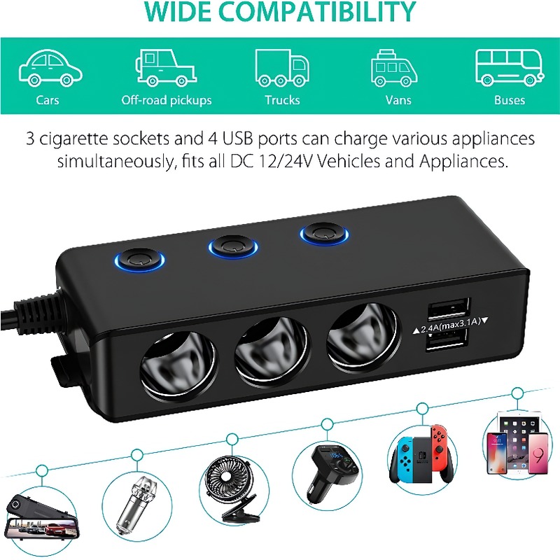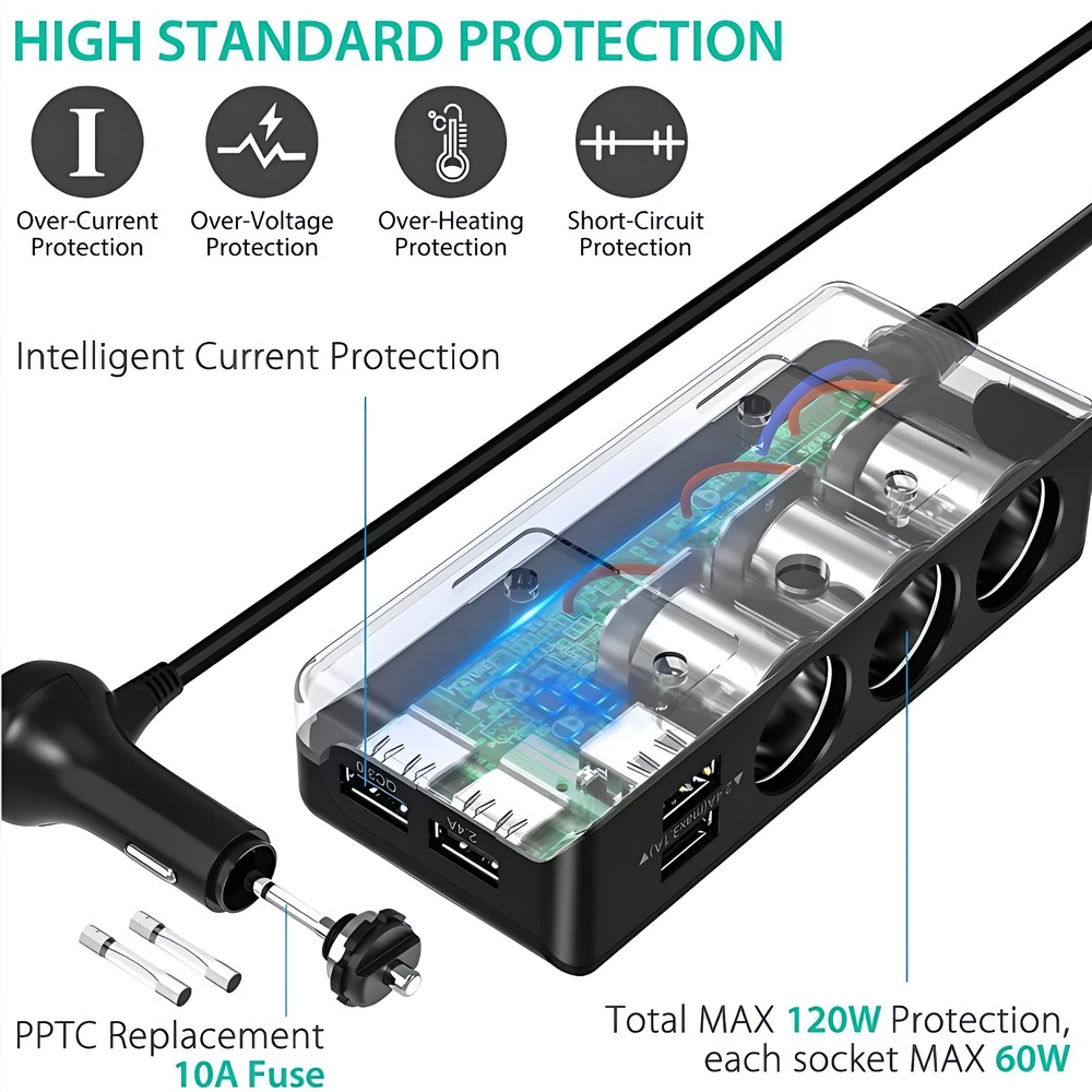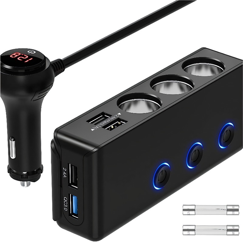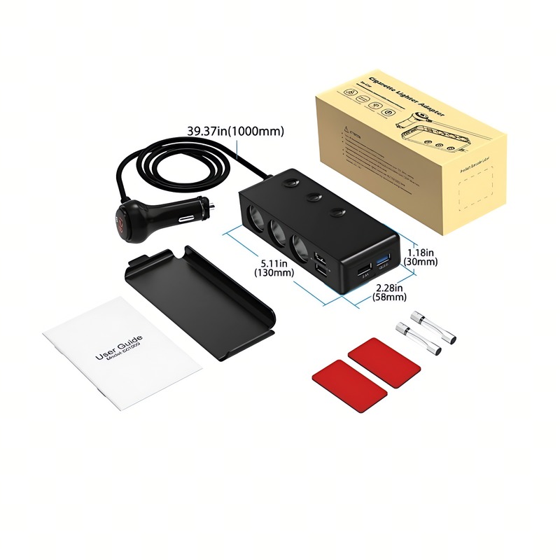 自营补贴3 Port Car Cigarette Lighter Adapter Stable Power Supply Splitter for Travel Charging一拖三车载点烟器,一个接口拓展出三个,可同时为多种车载电器供电,如手机、行车记录仪、车载吸尘器等。具备稳定的电流输出,保障设备正常运行,有效避免因功率不足导致的故障产品摘要