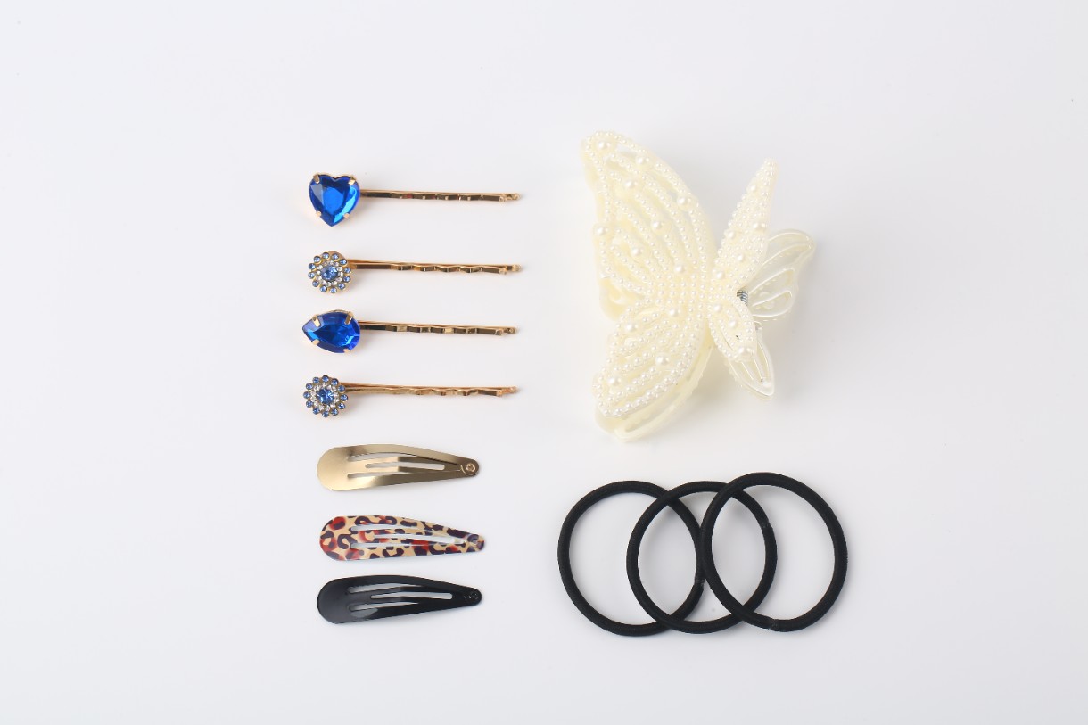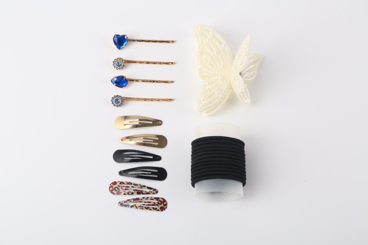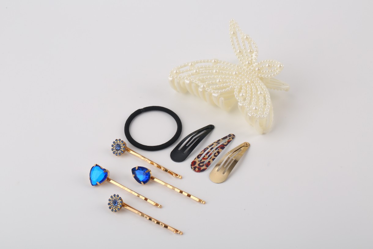 ,名人鲨鱼发夹、皮革发带发夹组成的四件套发饰套装,是兼具独特造型与时尚风格,可为发型增添亮点的发饰产品。