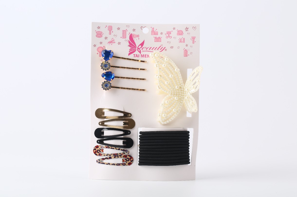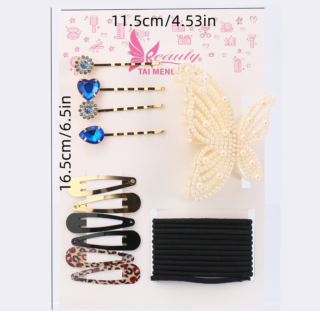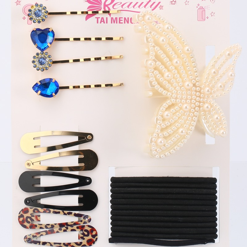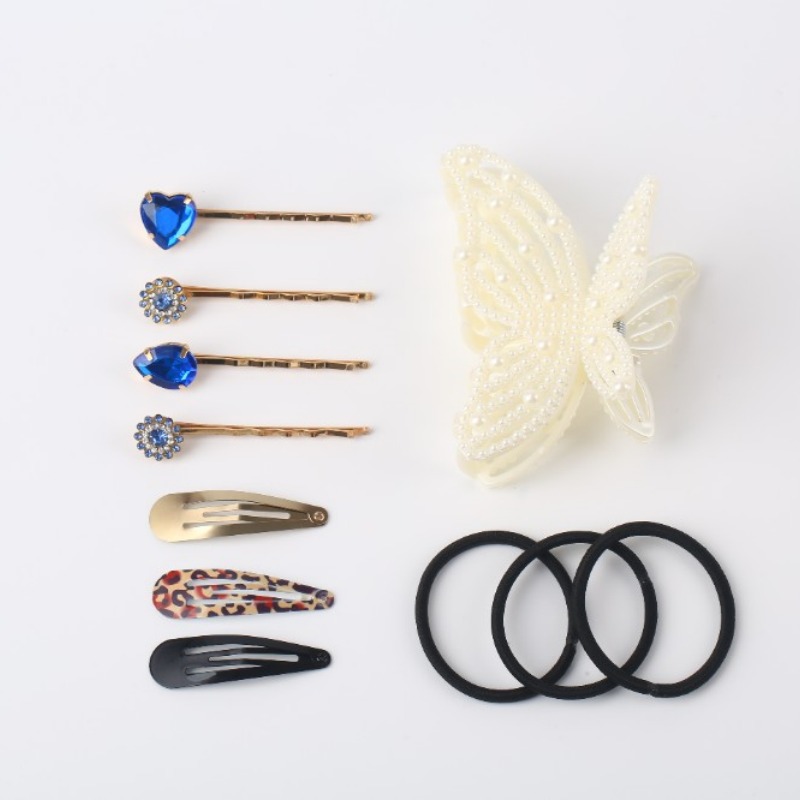 ,名人鲨鱼发夹、皮革发带发夹组成的四件套发饰套装,是兼具独特造型与时尚风格,可为发型增添亮点的发饰产品。