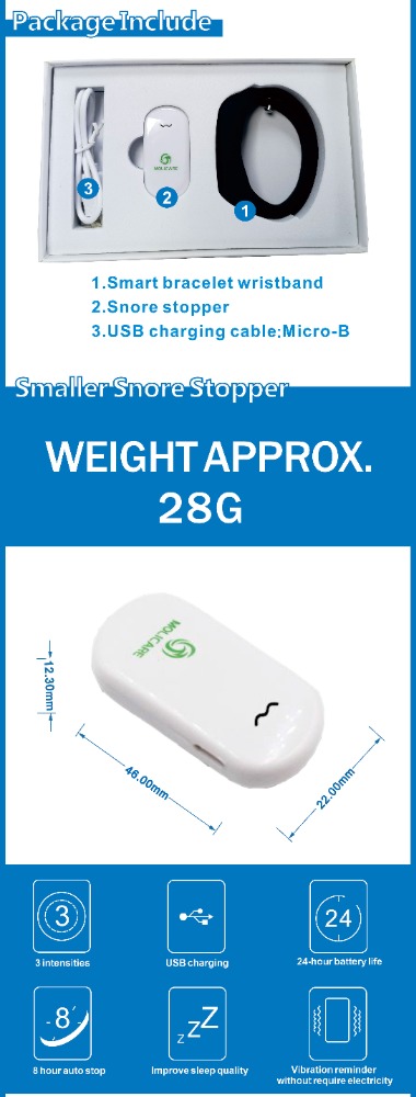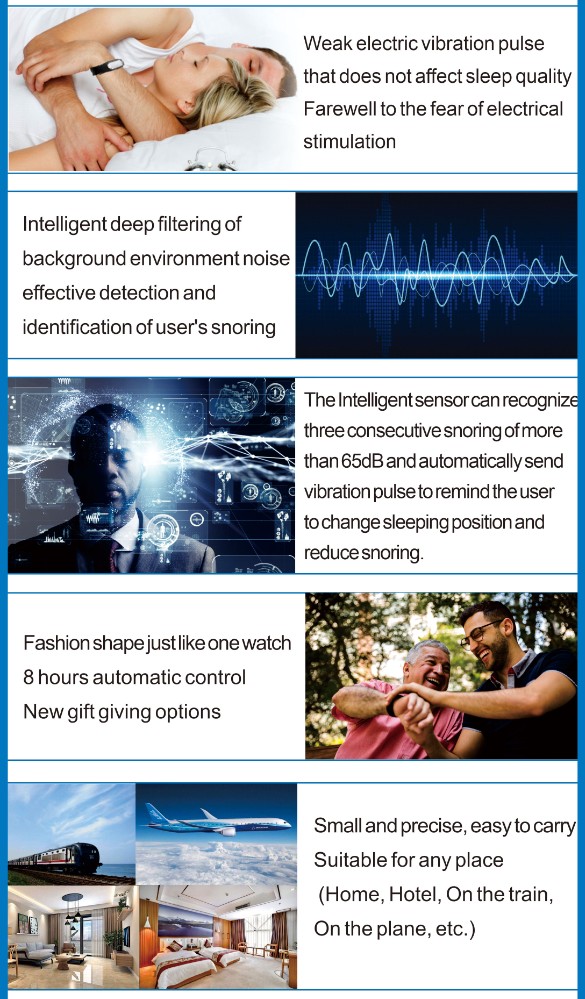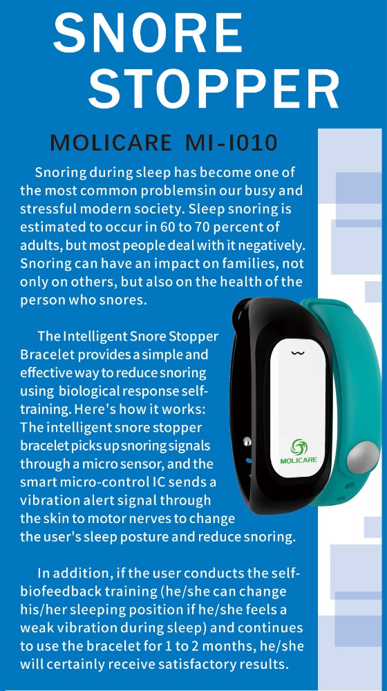 The Intelligent Snore Stopper Bracelet provides a simple and effective way to reduce snoring using biological response self-training. Here's how it works: The intelligent snore stopper bracelet picks up snoring signals