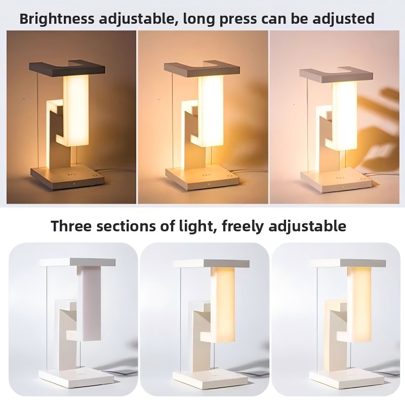 Creative floating desk lamp 1) features wireless charging function, touch switch, long-press brightness adjustment, usb plug-in design, simple and exquisite, LED energy-saving lamp, durable and long service life, LED eye-protecting energy-saving lamp, no dazzling, no flicker, three-stage color temperature light source, brightness adjustment