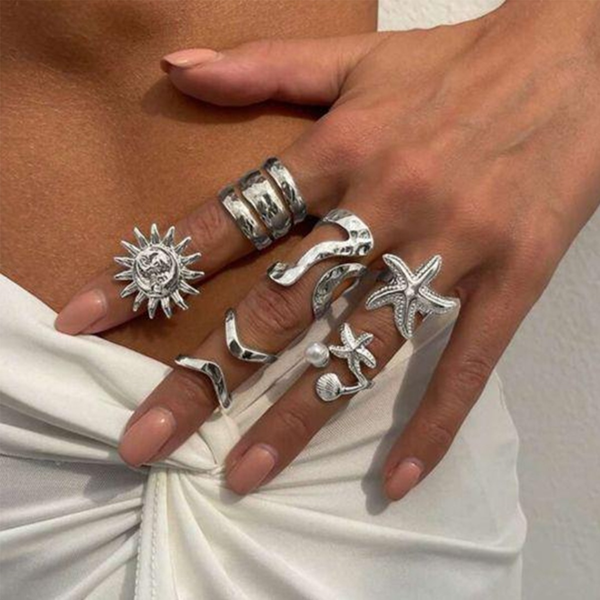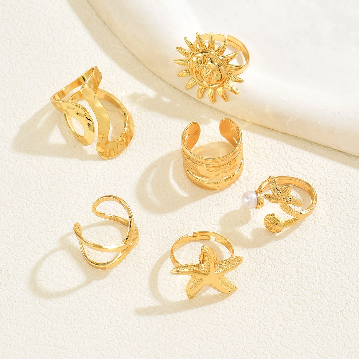 工厂有货Summer Sun Vacation Wind Matte Irregular Open Ring Starfish Imitation Pearl Set夏季太阳度假风麻面不规则开口戒指 海星仿珍珠套装,婚礼、派对、度假配饰,母亲节、情人节、结婚纪念日、生日礼物,万圣节、圣诞节礼物,日常佩戴