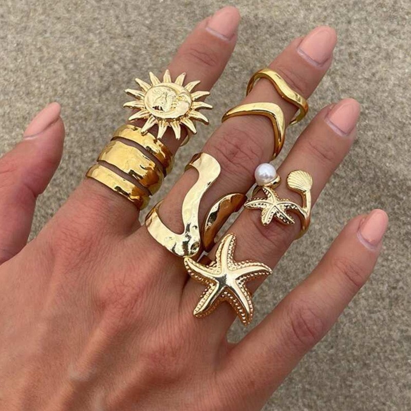 Summer Sun Vacation Wind Matte Irregular Open Ring Starfish Imitation Pearl Set